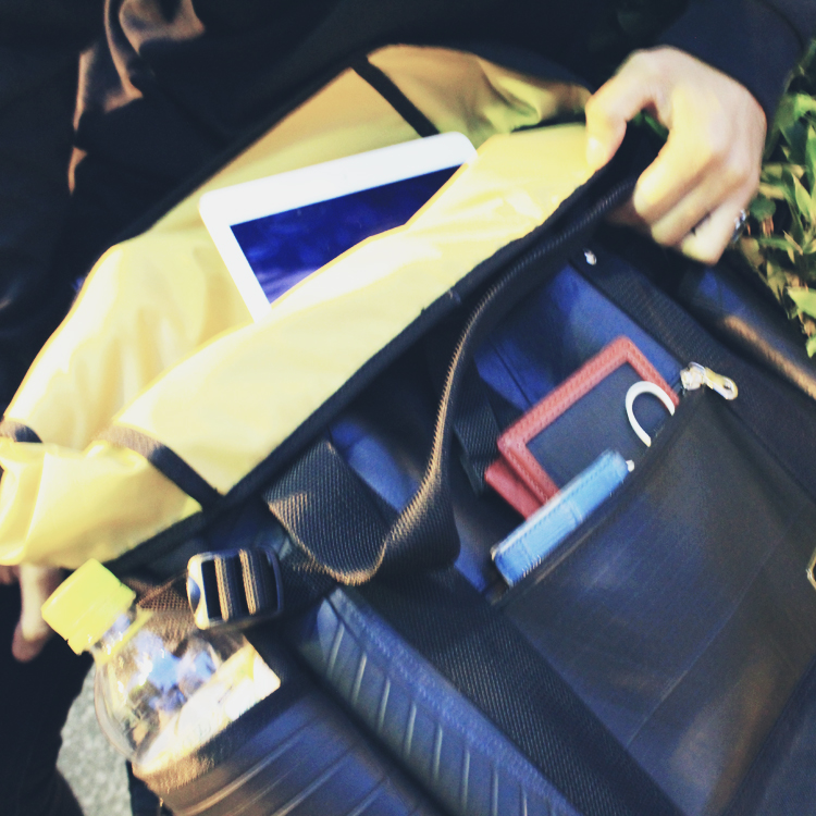 いろんなサイズのポケットがついていて、Ipadや、財布はもちろん、展示会にいくとついつい画集等を買ってしまったりするので、