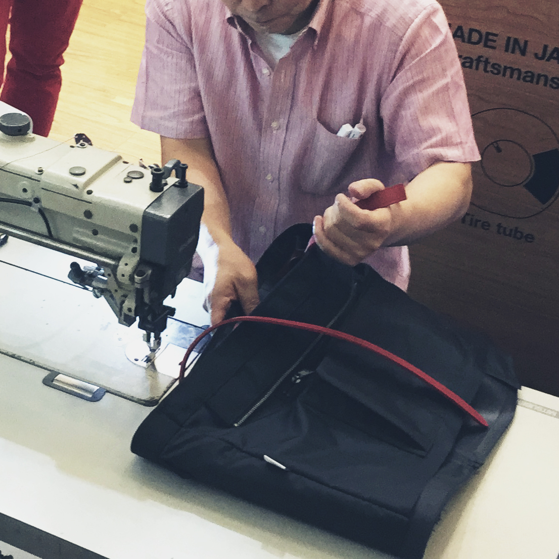 日本の職人による、香港現地でのビジネスバッグ縫製デモンストレーション。
