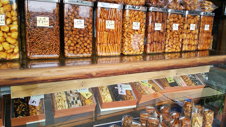 鴨川のすぐ近くに『本家 船はしや』というおせんべい屋さんがあり、こちらは落ち着いた雰囲気のあるお店で見ているだけでも楽しく、ついついお土産や食べ歩き用として買いたくなるおせんべいが沢山ありました。
