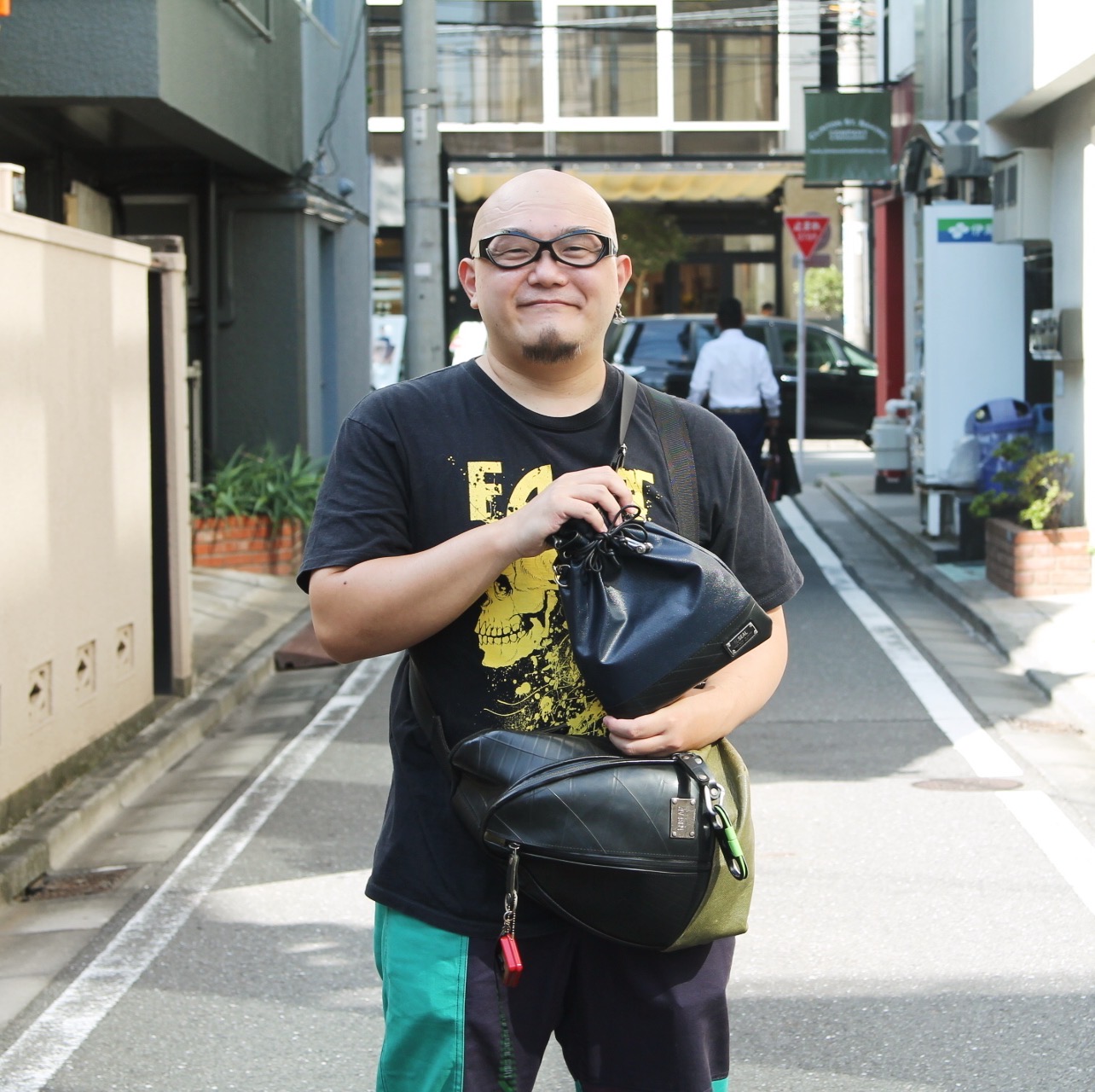 良い感じに馴染んだデザイナーズボディバッグにキーホルダーがとてもいいアクセントに。