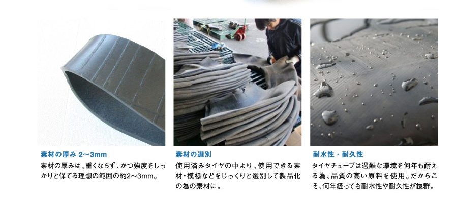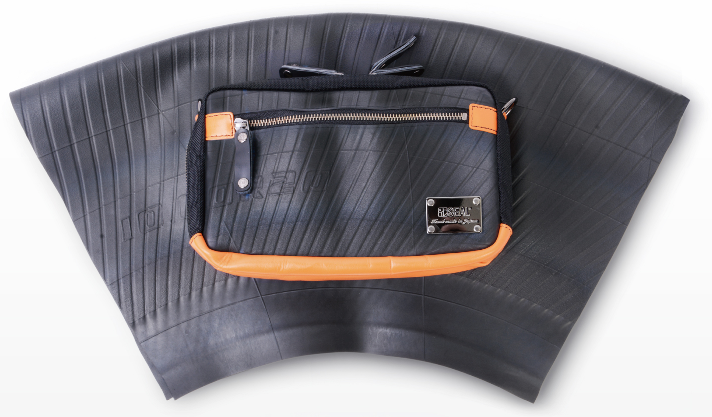 鞄等のメインとなる素材は使用済みのタイヤチューブを再利用しています。