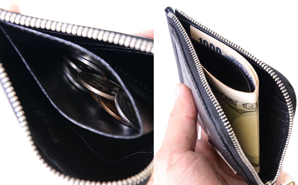 内側は「Z型の構造」になっていて、この作りとコイン収納部分のファスナーを取り除いた事によって、