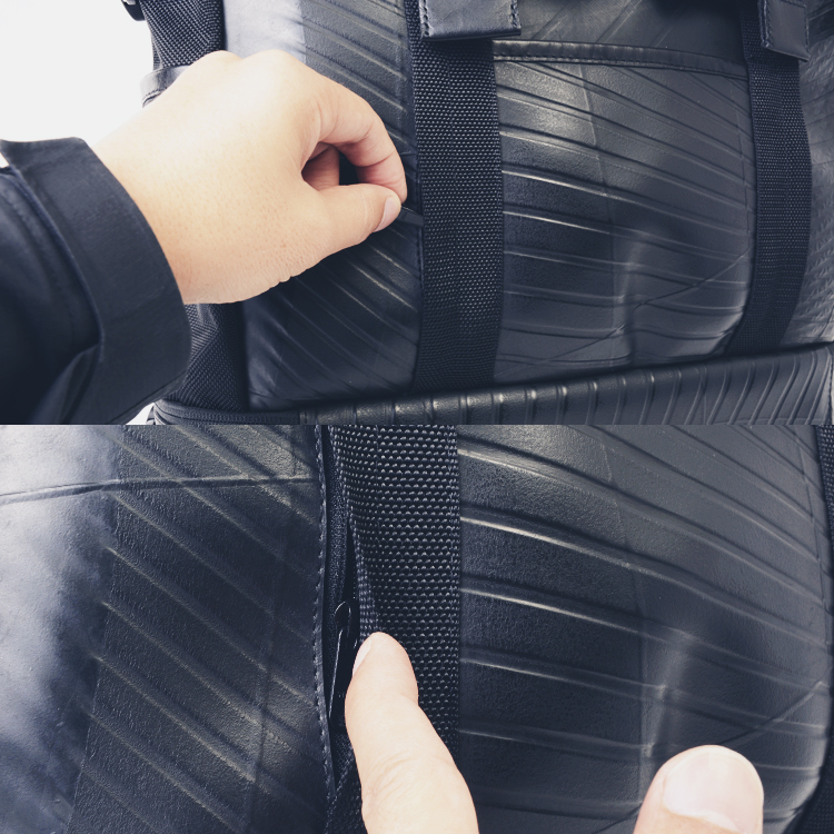 (背面には2つのポケットが隠れていたり、内部にもファスナーポケットがひっそり隠れているというところも、ワクワクするポイントの1つです。)