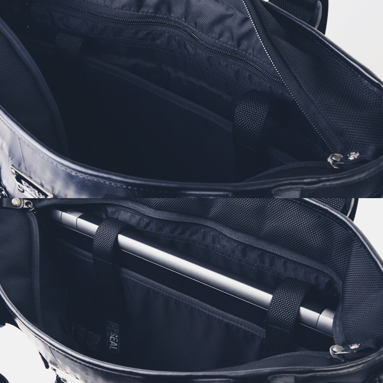 (トートバッグ本体内部のノートPC専用ポケットはマジックテープで高さの調整が可能。内装ナイロンが底上げされ際に入れにくさがないよう工夫されています。)