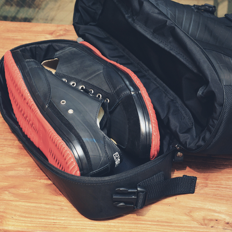 トートバッグの底部分には仕切られた別のスペースがあり、シューズが1セット収納可能です。本体側の内装ナイロンが底上げされるように作られており、外見からは靴が入っているようには思えない高さを実現することができました。鞄を使っている方が楽しめる機能を加えたいと考えている際に、田中さんが考えてくださったアイディアです。また、鞄自体の形崩れがしにくく、中身を入れなくてもきちんとバッグが立つように厚めのクッション材や芯材を入れているので、カメラや電子機器の収納にも安心です。