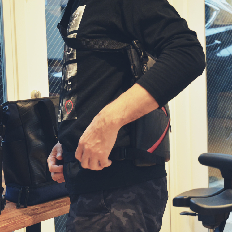 また、先程のトートバックに付属しているベルト(※背面キャリーケース用ベルト)を今度はお腹側でベルトを固定し、ショルダーバッグの底部分を腰に密着させ、ショルダーベルトも使用して方から背負うと、バッグの荷物の重さが分散され、ショルダーバッグとウエストバッグの間を取ったような新しい背負い心地が体験出来ました。鞄を身体に密着させ、安定して荷物を持つことが出来るのでバイクや自転車の運転やランニングなどにも良いのではないかなと思いました。