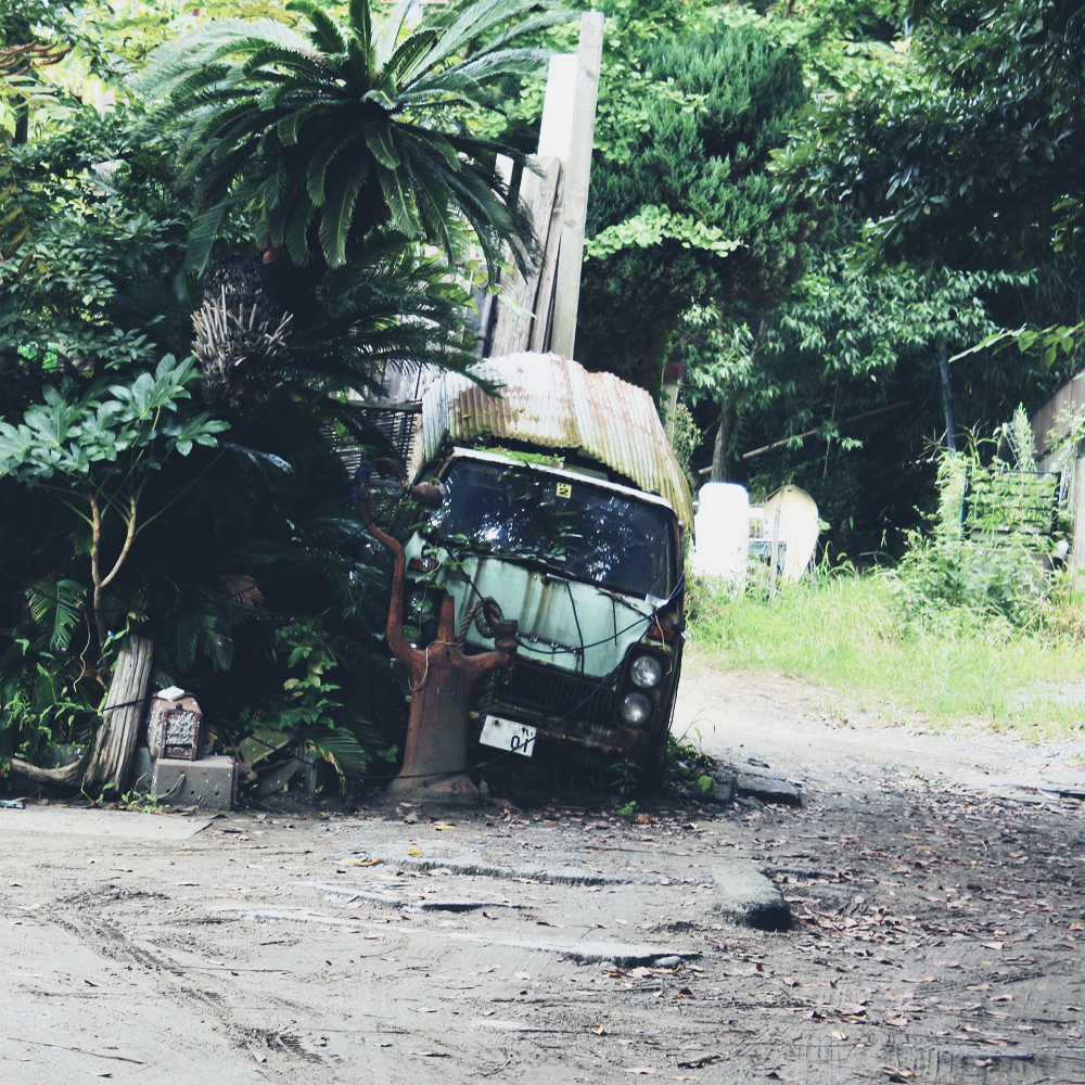 その小道にはレトロな車があり、さらに進んでいくと「かねよ食堂」の入口が見えてきます。