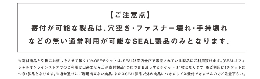 SEALの新たな社会貢献活動として、海外への物資支援による寄付を行っています。古くなったSEAL製品を直営店舗にてお預かりさせていただき、海外途上国へ物資支援による寄付を実施しています。お持ち込みいただきましたお客様にはそのお礼として、SEAL路面店全店※でご利用いただける10%OFFチケットを差し上げております。※オンラインストアは除きます。