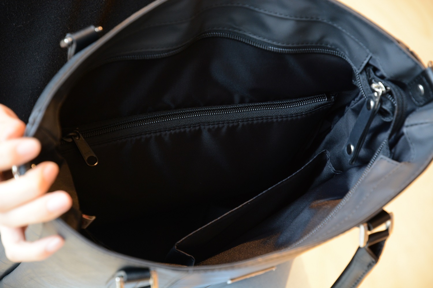 まずはトートバッグなのにファスナーがついていて、内側には収納ポケットもあります。