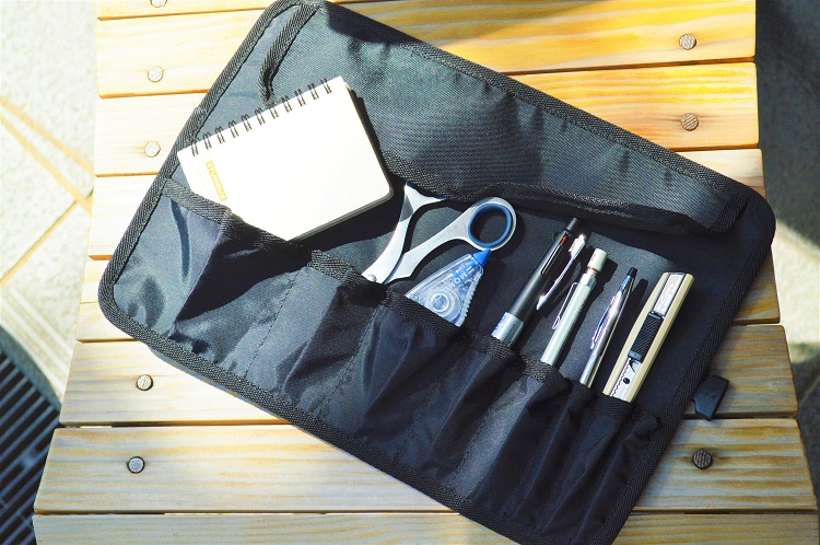 大小8つのポケットにはペンやハサミ、メモ帳etc…必要なモノは全て収まります。