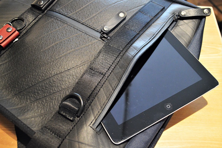 正面に装備されたポケットは広々でタブレットもすっぽり収まります。