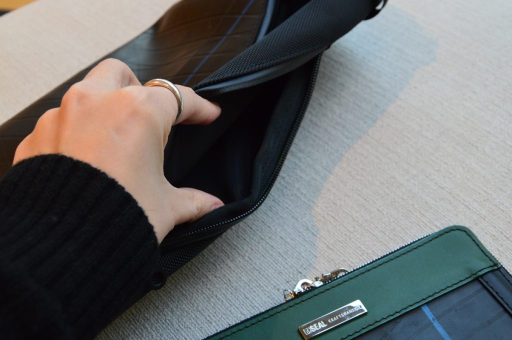 メインファスナーとサイドのファスナーの2ヶ所から取り出しが可能!
