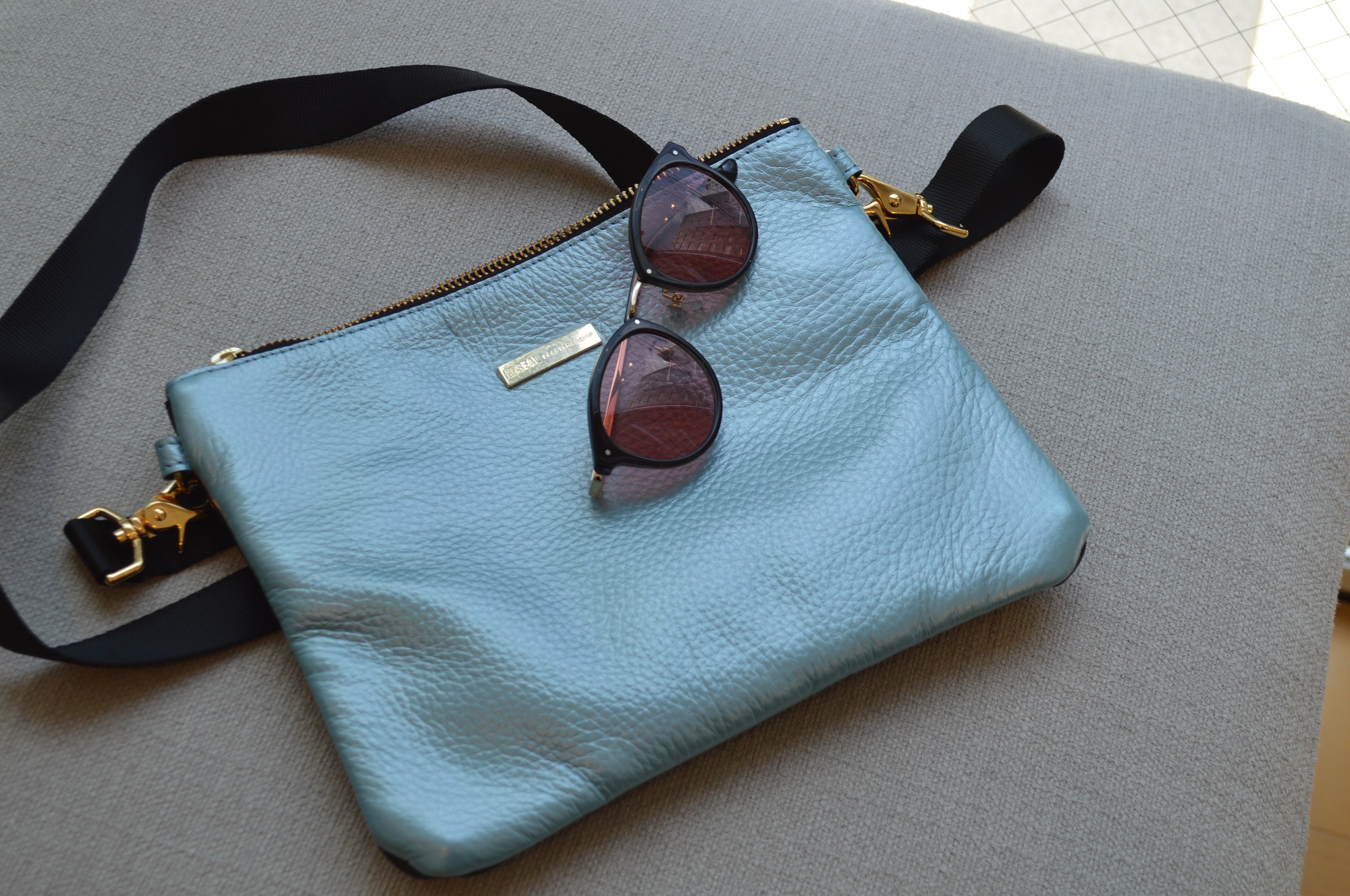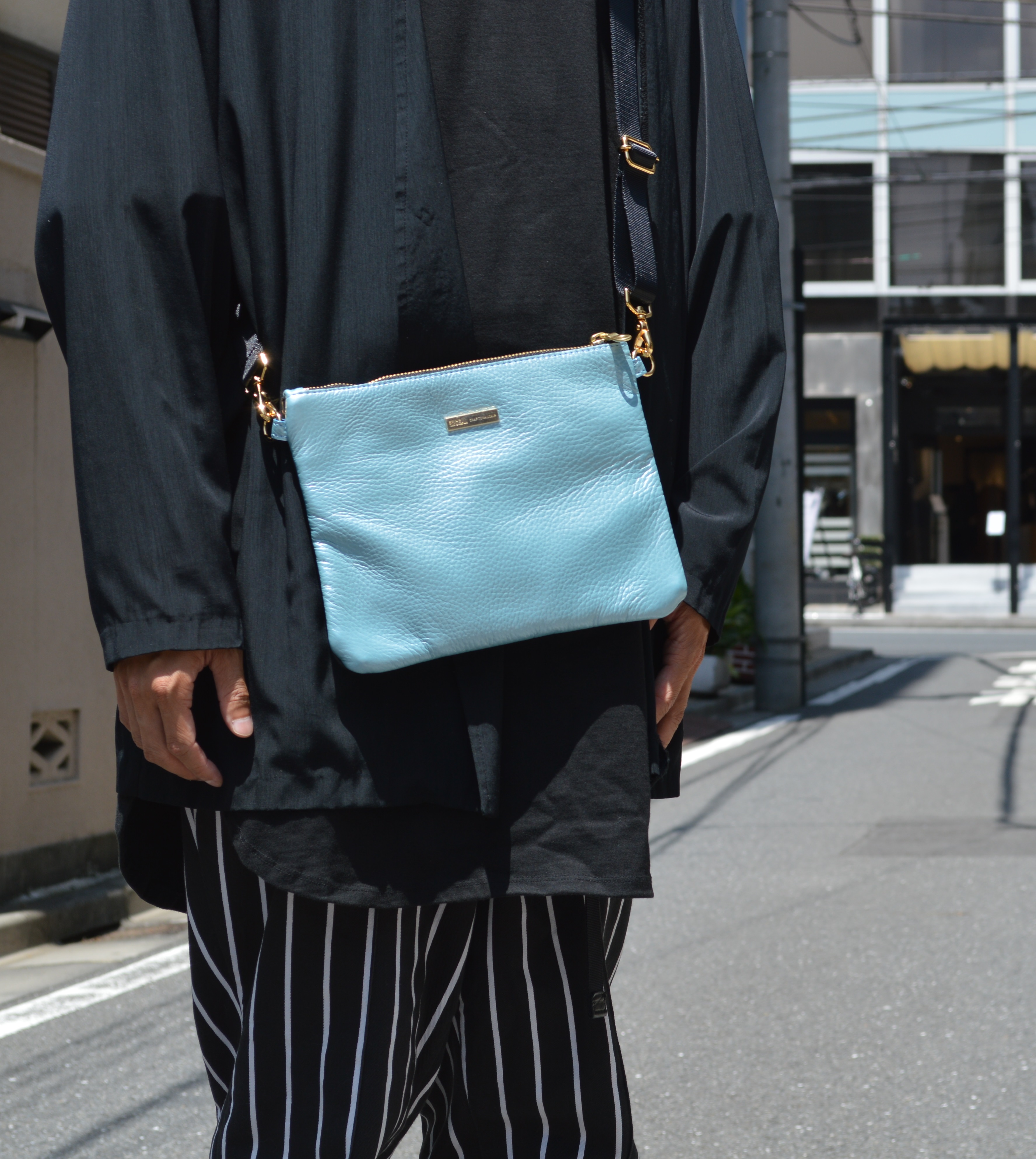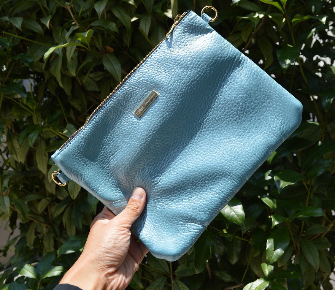 爽やかなブルー。少し光沢感のあるレザーをチョイス致しました。