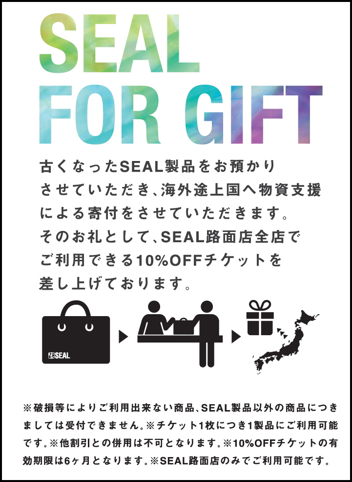 使わなくなったSEALのお鞄を店頭へもってきていただければ店頭で使える10%OFFクーポンと交換させていただきます。