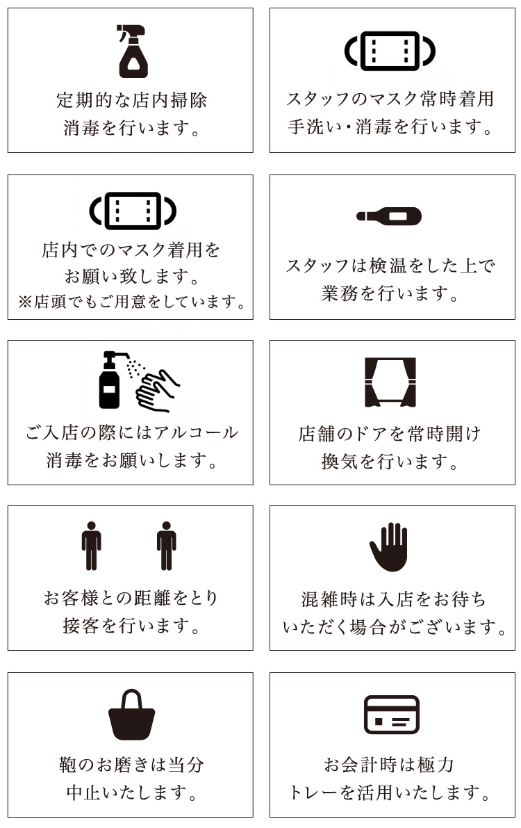 営業再開にあたりお客様、スタッフの安全を考慮し以下の内容を実施いたします。