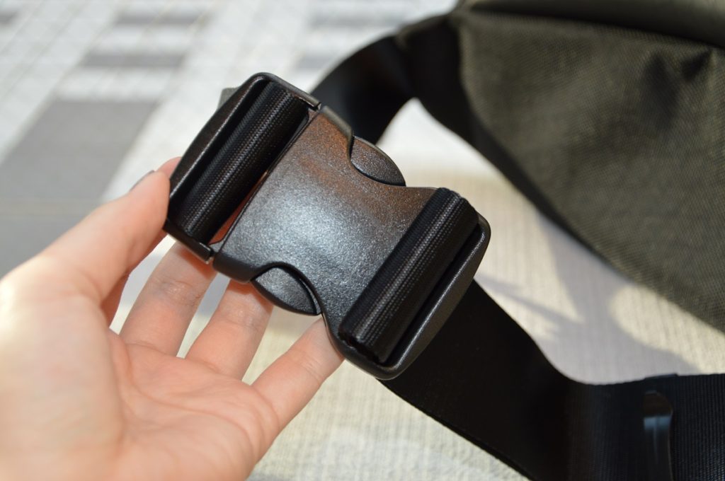 さらにバックルで着脱可能なのでヘルメットや帽子を被っていても引っかかりません。