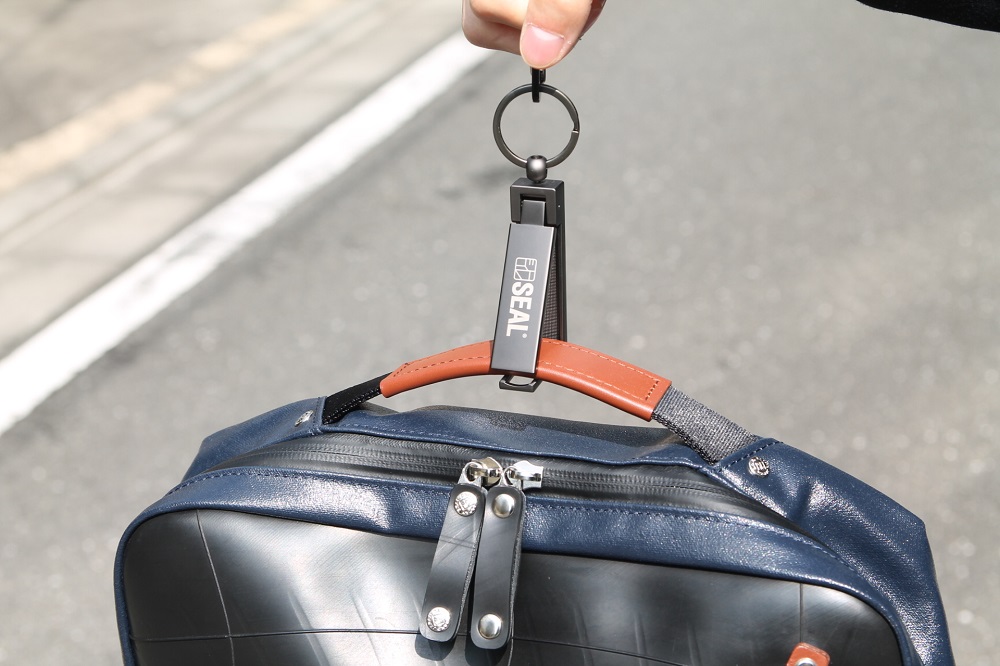 また、付属のカラビナを使用する事でハンガーとして利用可能に。(引っ掛けられます。)