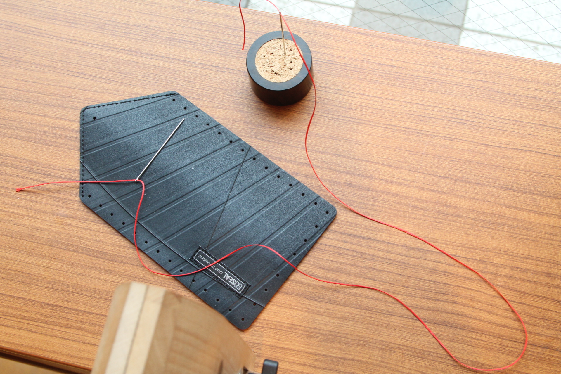 まずは縫い穴を重ね合わせて、半分に折り重ねます。