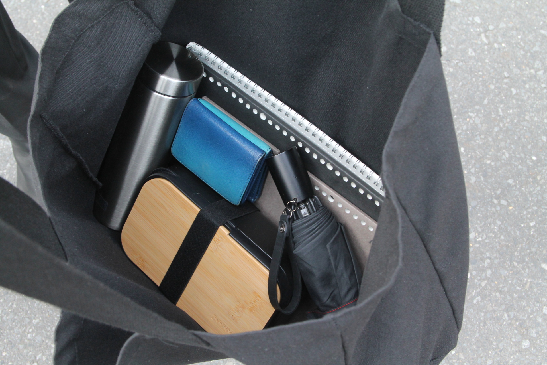 A3サイズが収まる容量、お弁当や折り畳み傘などを一緒に入れても、問題がないサイズ感となっております。