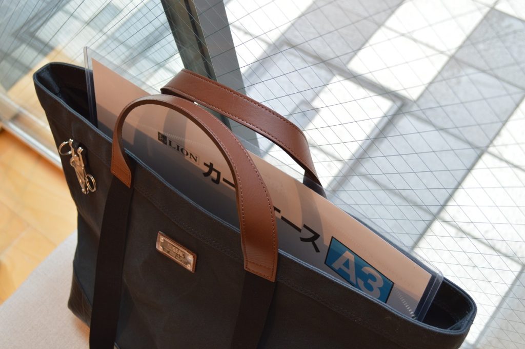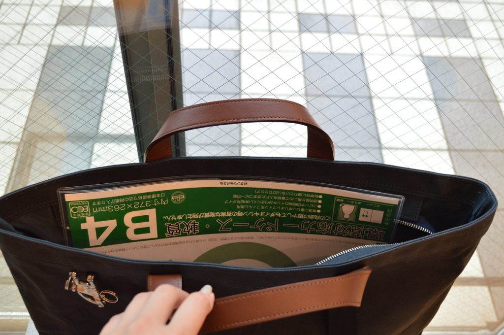 サイズはB4が入る大きめのトートバッグです。入れても横幅はまだまだ余裕ですね。