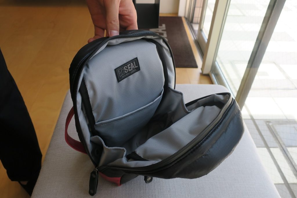ブラックのパラシュート生地に、レッドの止水ファスナーを使用。
