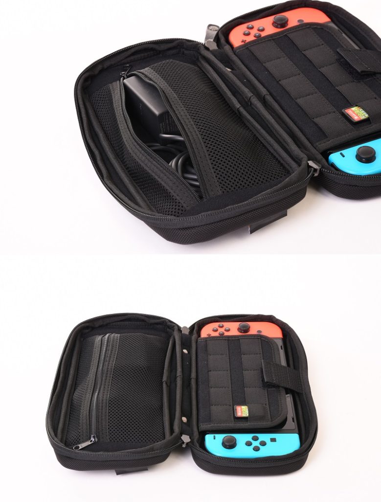 Switchのケースはモコモコの緩衝材で保護し、本体を閉じた時もSwitchのスティックを反対側の緩衝材が保護し潰れるのを軽減してくれます。