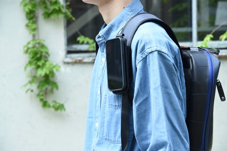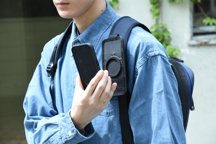背面のベルトホルダーを使ってリュックやショルダーバッグに装着することにより瞬時に取付け取外しがワンアクションで出来ます!