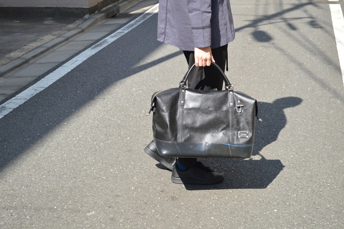 帆布素材とタイヤチューブというタフな素材の組み合わせで作られたボストンバッグは汚れてしまったり、濡れてしまったりする場面でも気にせずお使いいただけとても便利です。
