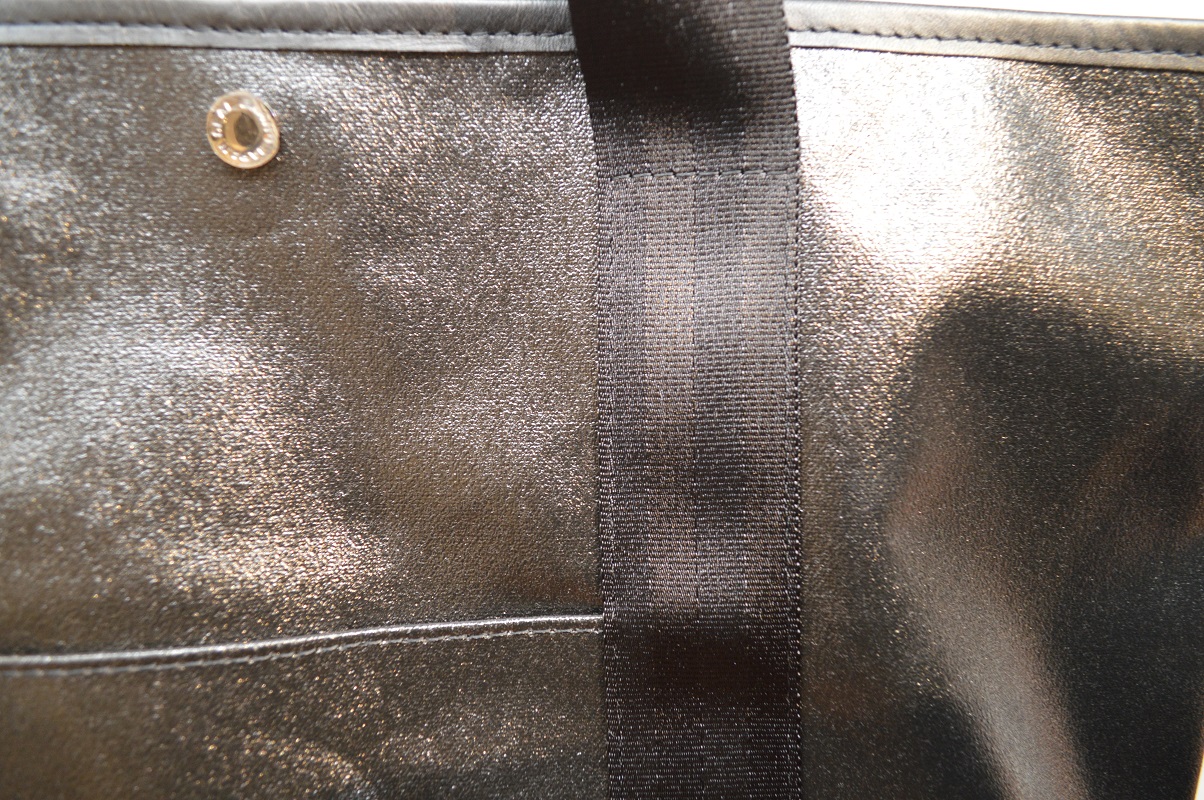 滑らかなストライプ柄のベルトはフィット感よく、シンプルなトートバッグを品よくまとめます。