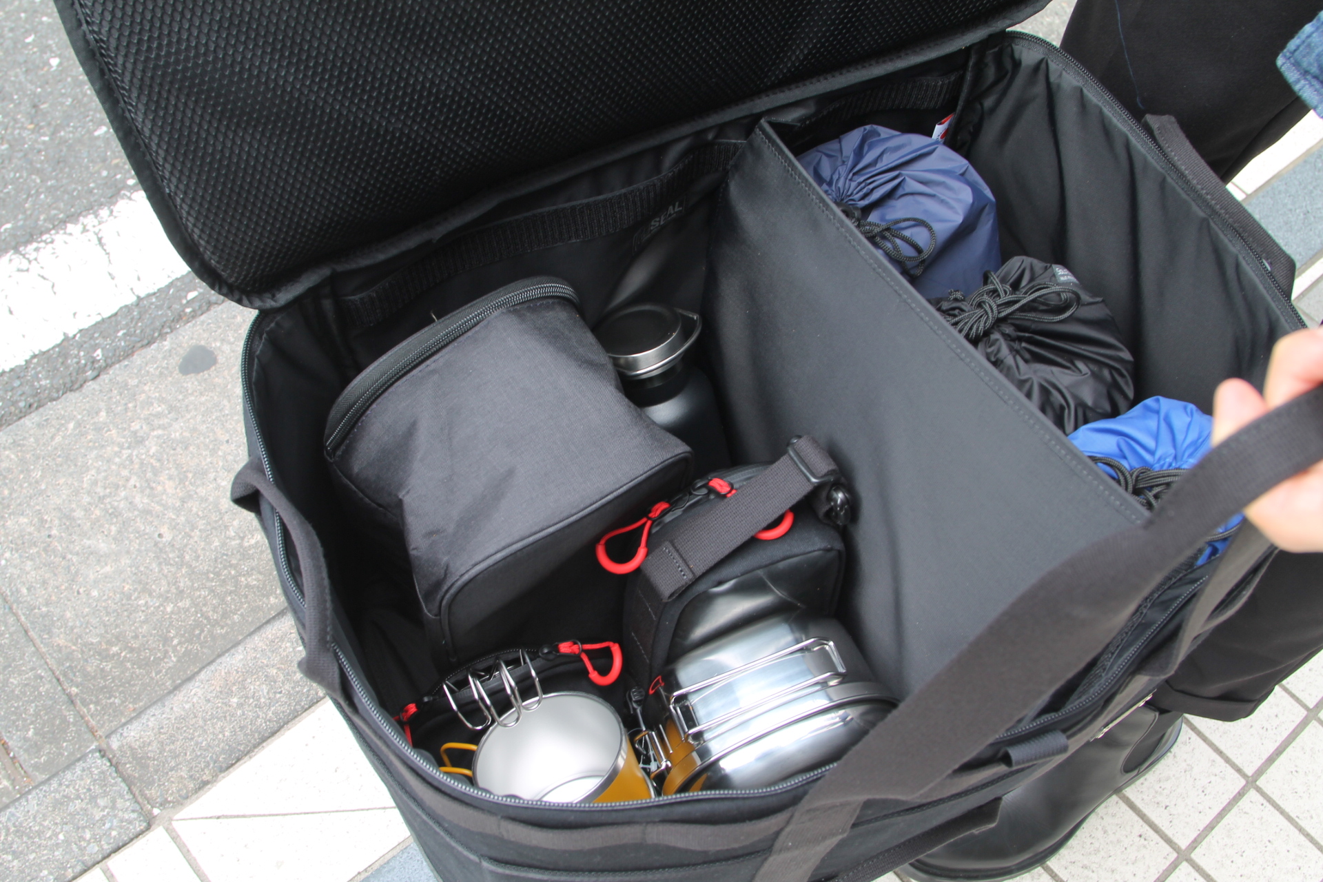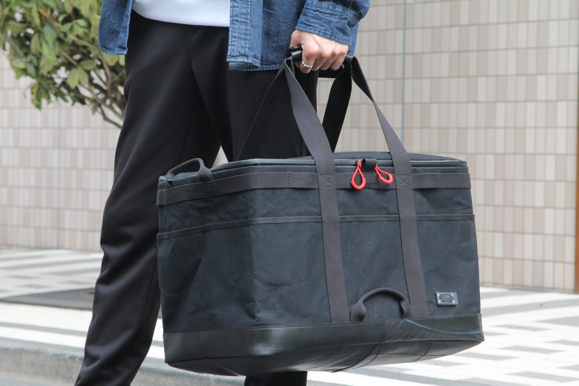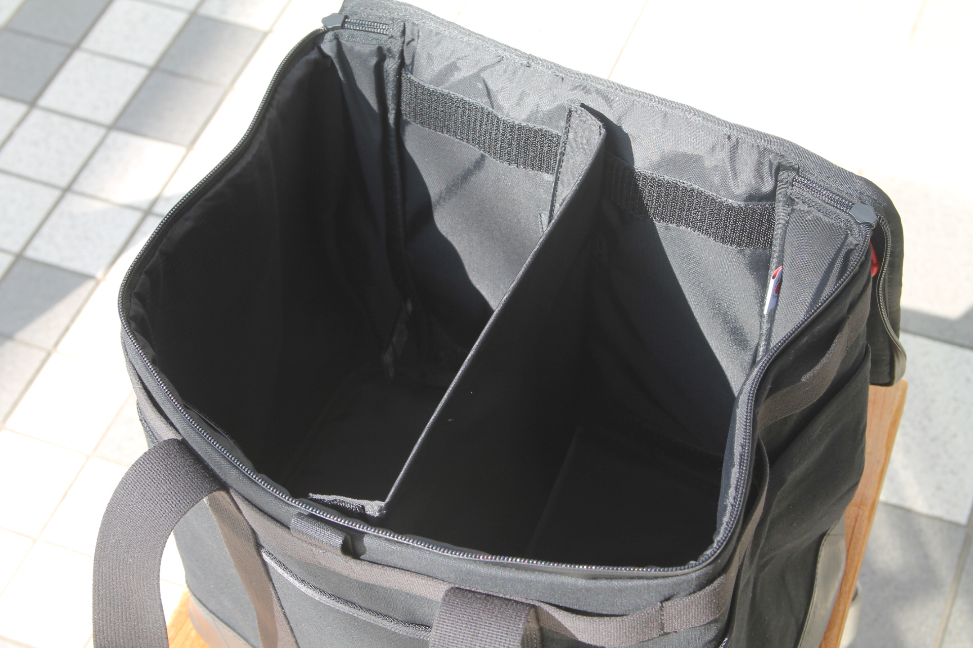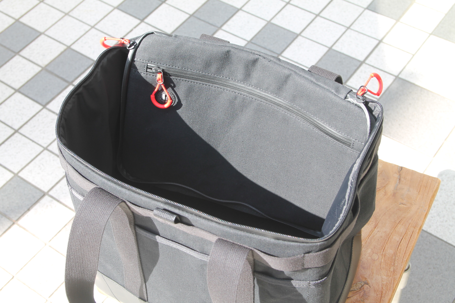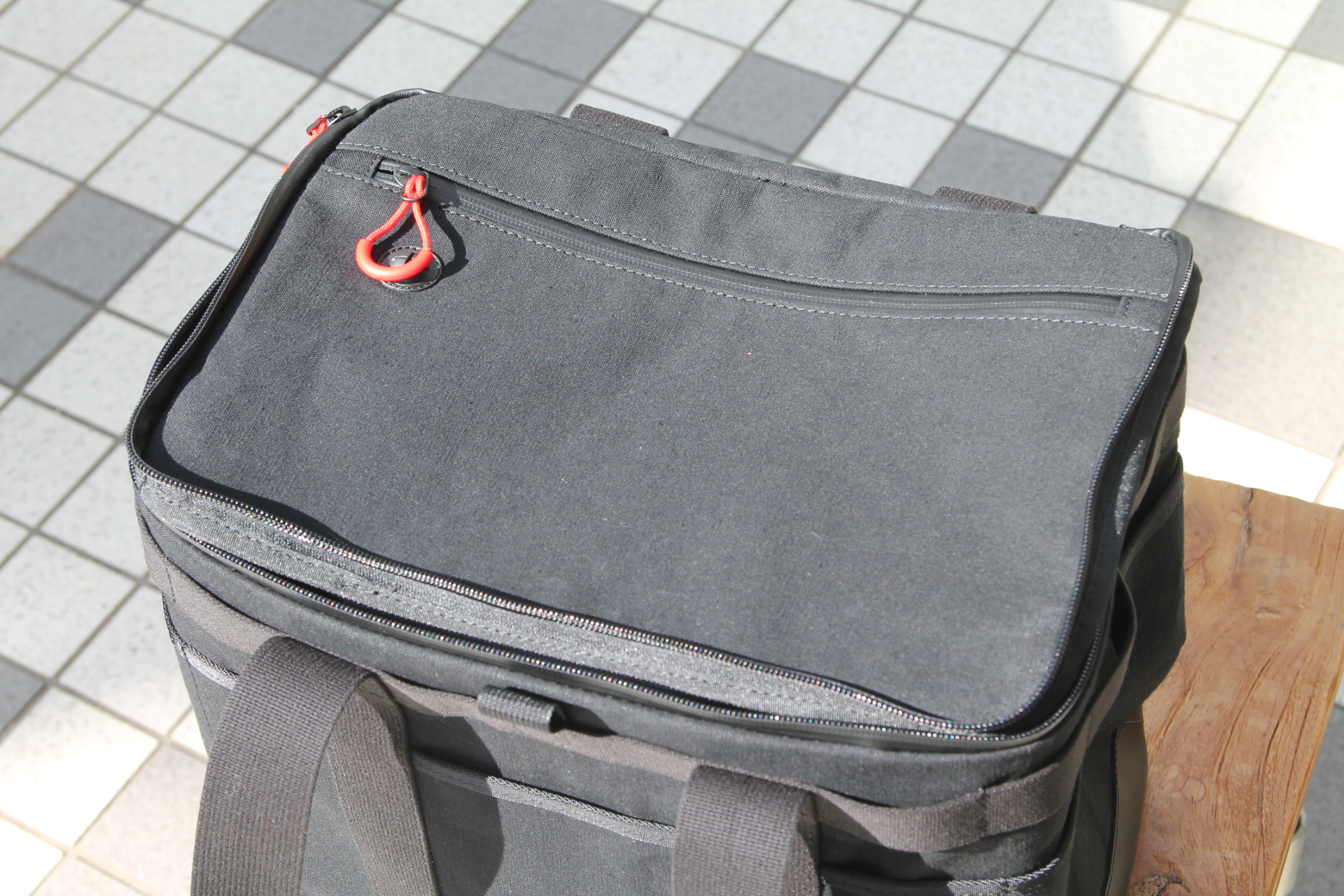 一見アウトドア専用のギアコンテナですが、上部面のフタをバッグ内部に収納し