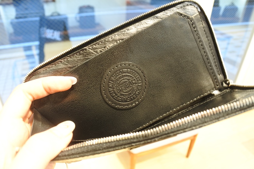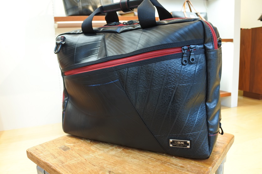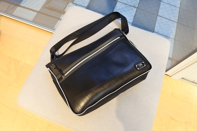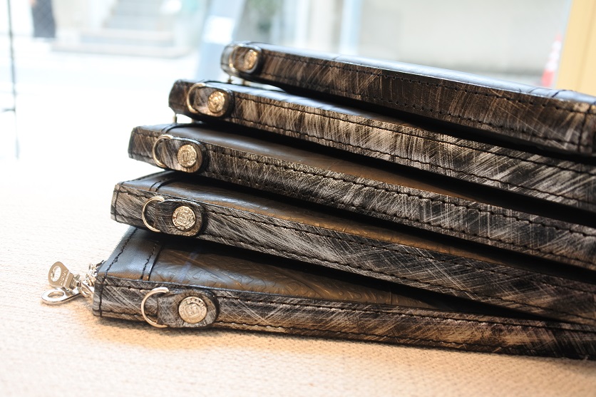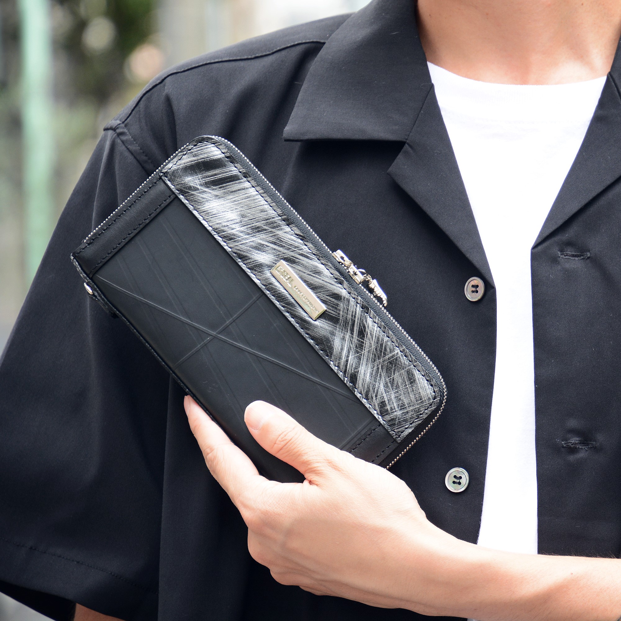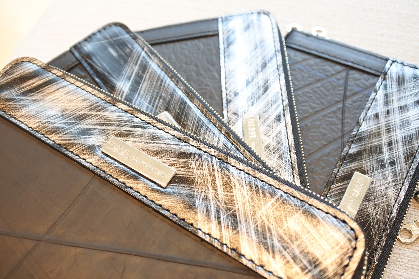 ブラックにシルバーの色味がランダムに施されており、タイヤチューブだけでなくレザー部分も一点もの。