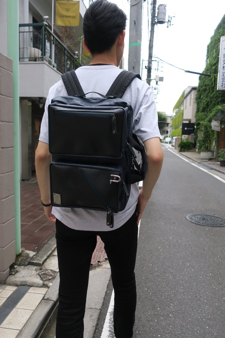 リュックにしてしまえば両手が空くので、出張のキャリーケースを持てたり