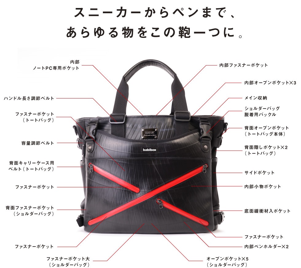 それ以上にポケットの多さや靴の収納、持ち手の長さ調節、キャリーケースにもつけられる、など
