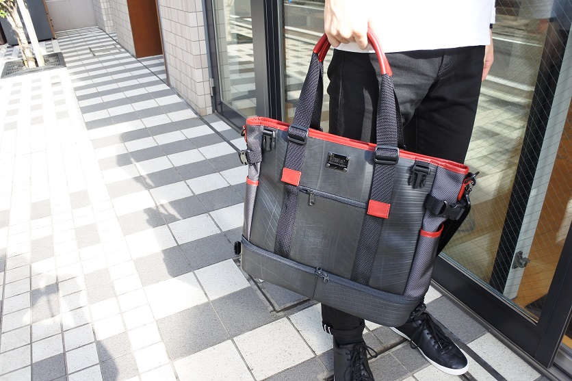 まず、シンプルな持ち方。大きなトートなのでこれで1泊~2泊は行けますね。