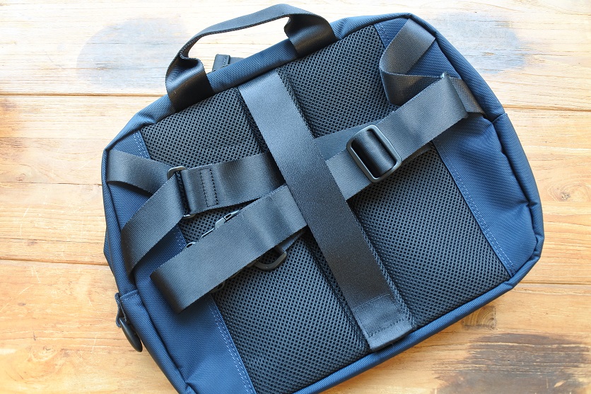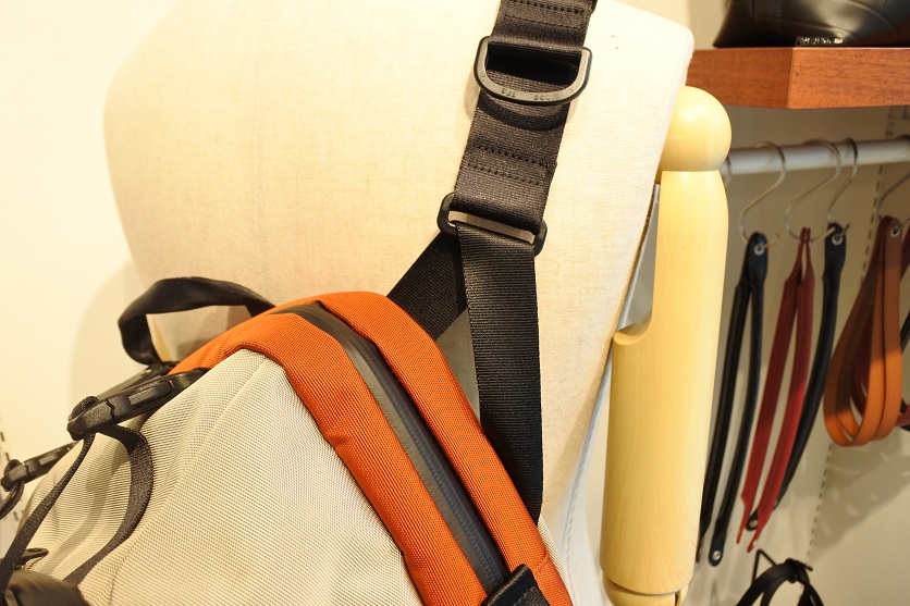 背面にはショルダーベルトをまとめられる専用ベルトを搭載。