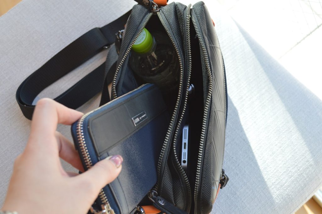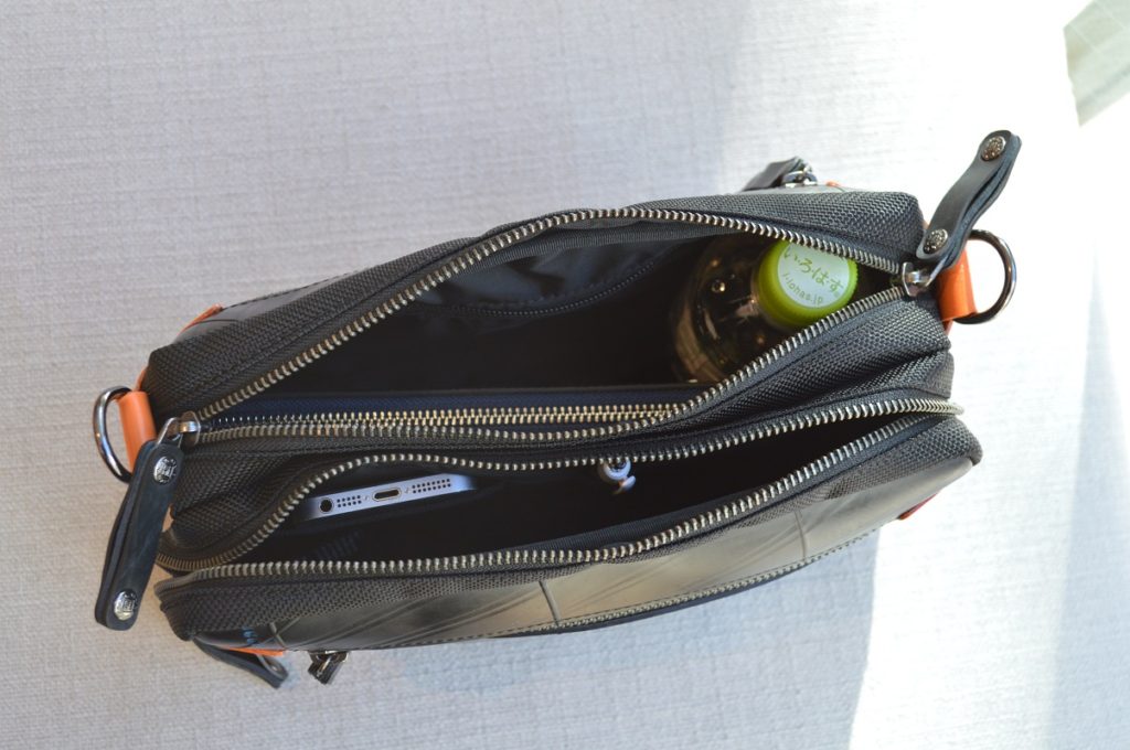 背面部分はマチをしっかりとっているので、ペットボトルやカメラなども入れていただけますよ。