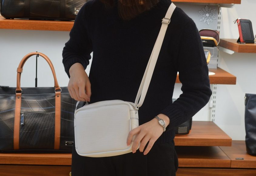 白い鞄はどうしても汚れが気になりますがこちらの製品は水にも汚れにも強いホワイト。