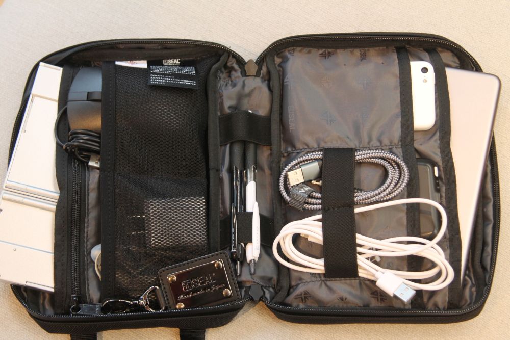 大切に持ち運びたいアイテムを収納(iPadmini/折り畳み式キーボード/スマートフォン/ケーブル/アダプタ/マウス/バッテリー/SDカード/USBメモリ/イヤホン/携帯用ライト/ボールペン)