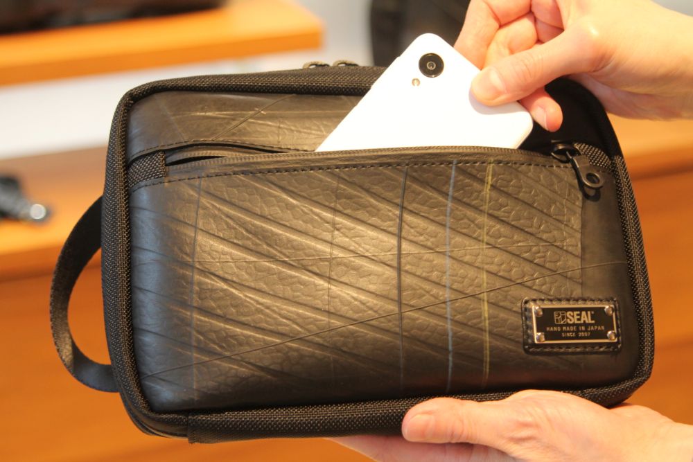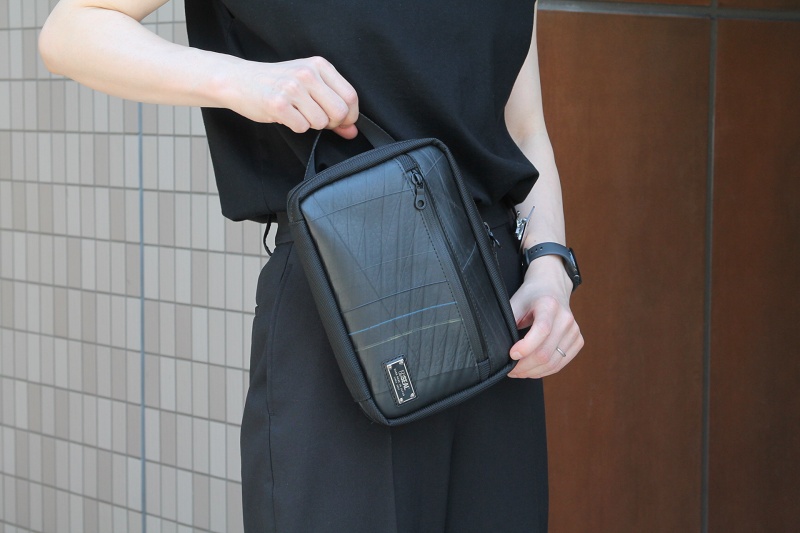手から滑り落ちるのを回避するサイドハンドルは必要不可欠。そして、ミニバッグとしても活躍します。