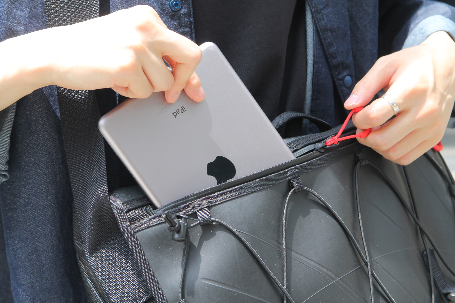 雨などが当たりやすい正面部分は止水ファスナーによりポケット内の荷物も安心して持ち運べます。