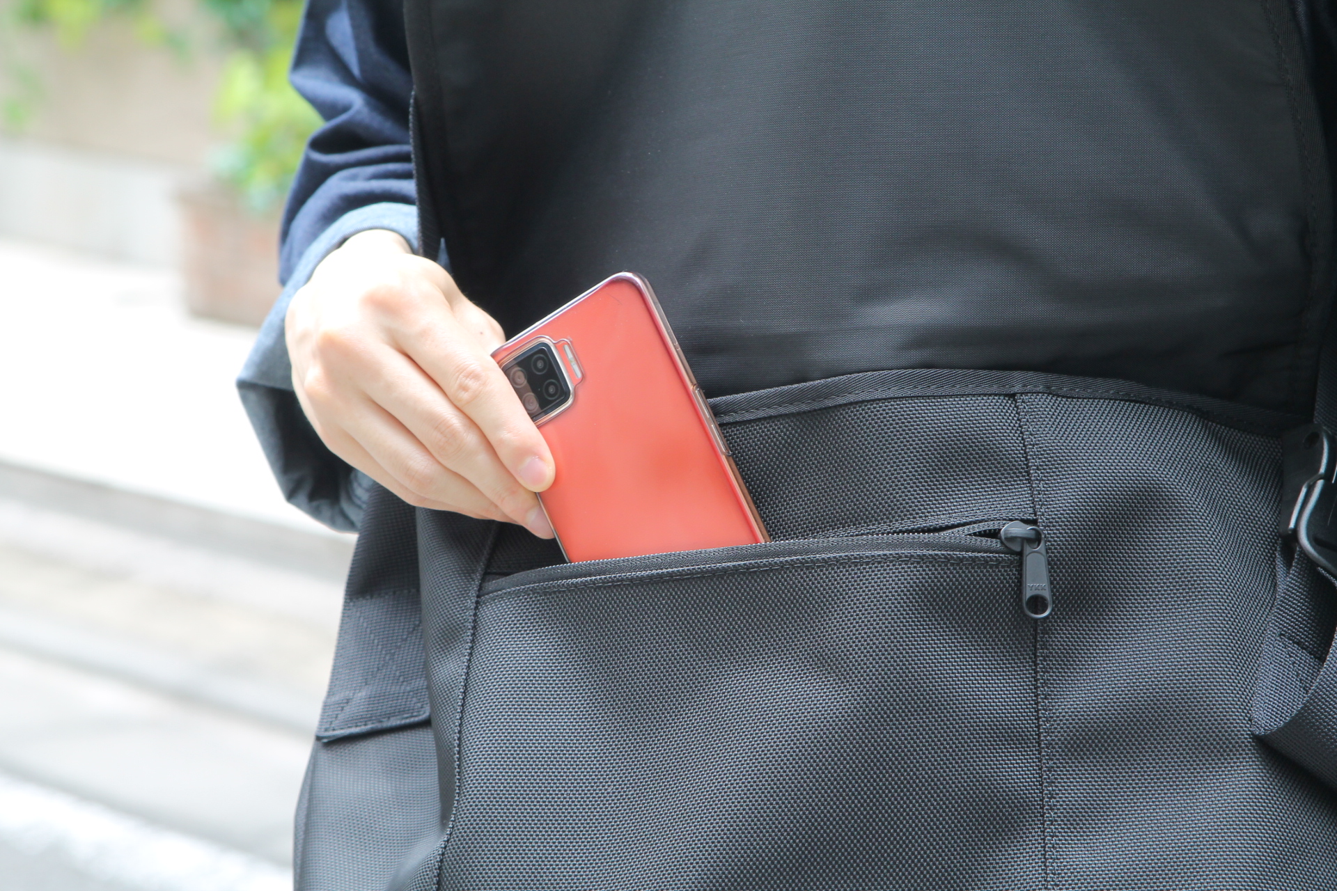 スマートフォンなどがちょうど収まるサイズが前面の位置にあるのは嬉しいですね。