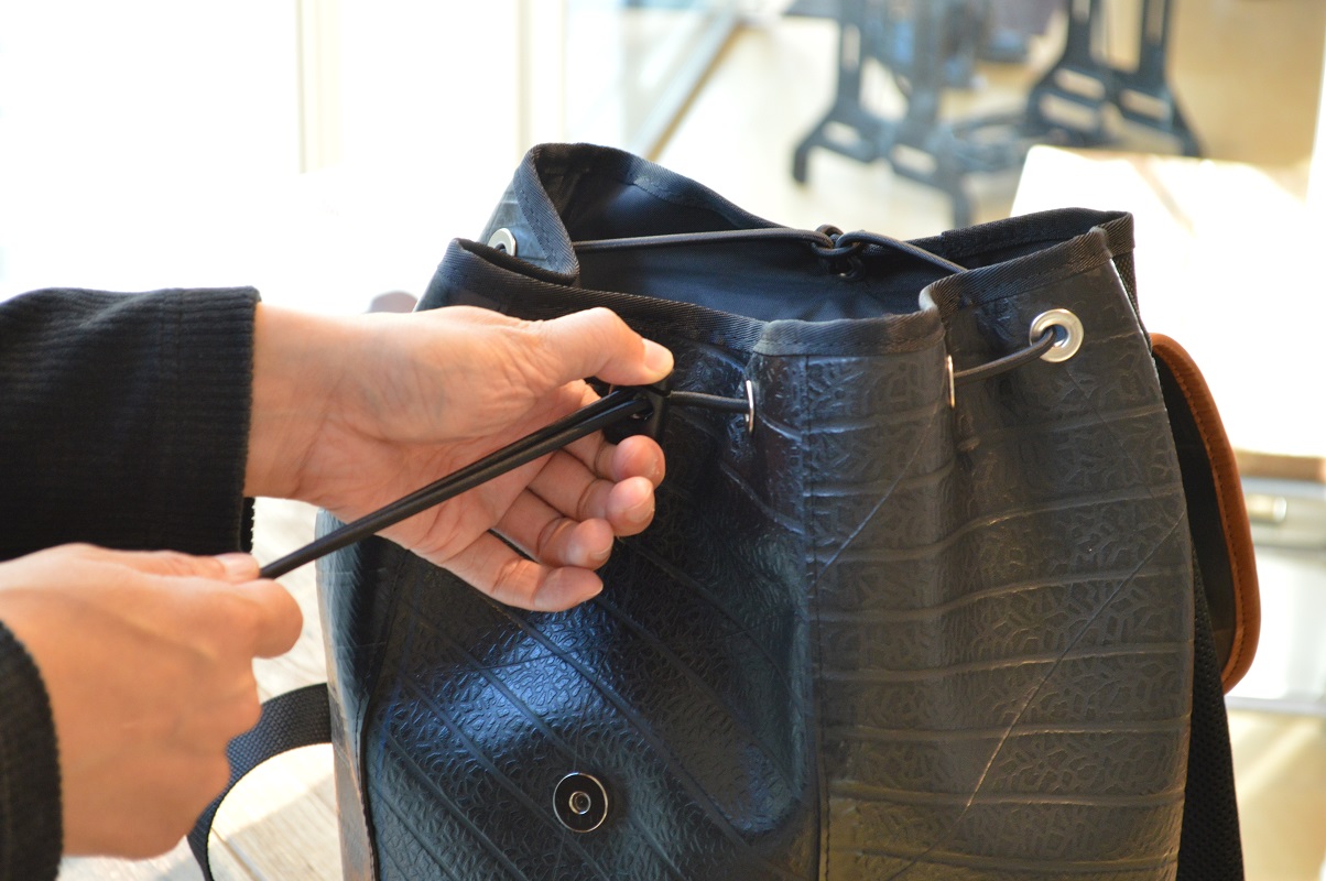 フラップを開けると巾着型になっていて荷物をザックリいれても上を絞れば安心。