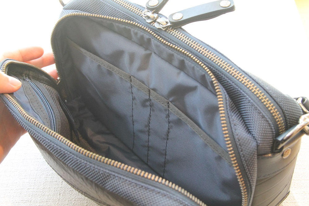 メイン収納部分はロングウォレットや500mlペットボトルぐらいであれば余裕を持たせて入るスペースがあるのは嬉しいところ。
