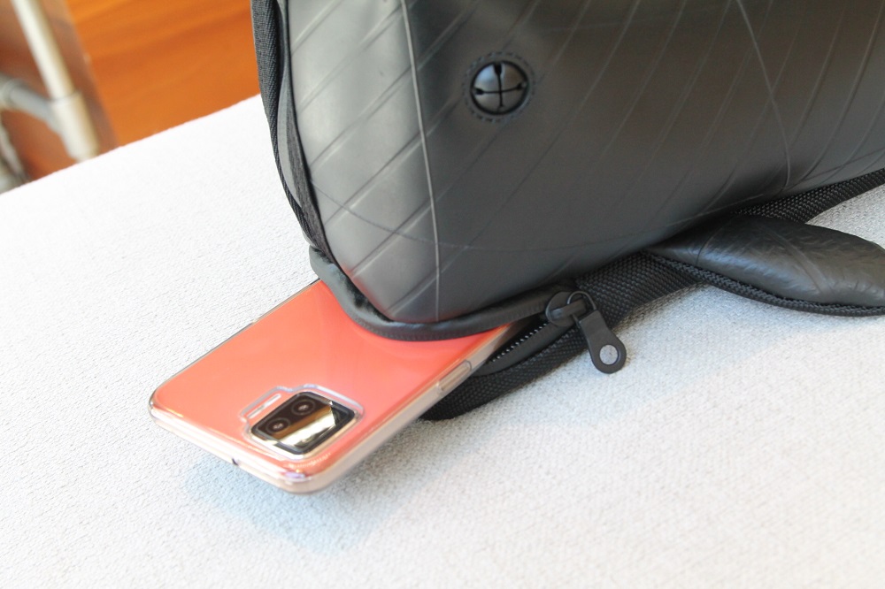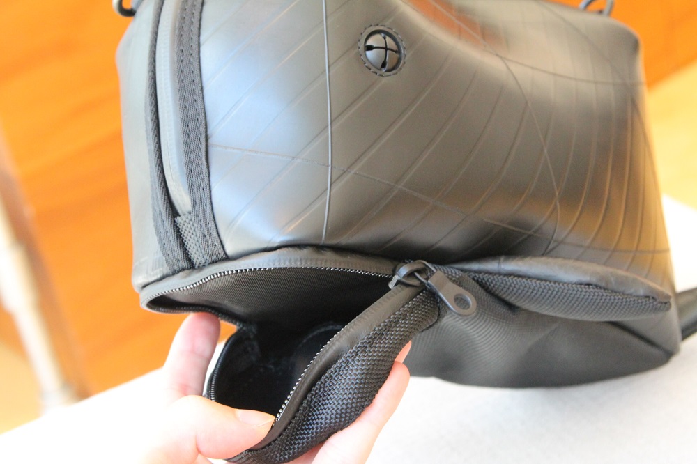 口の部分は実はファスナーポケットになっており、スマートフォンぐらいでしたら収納が可能です。