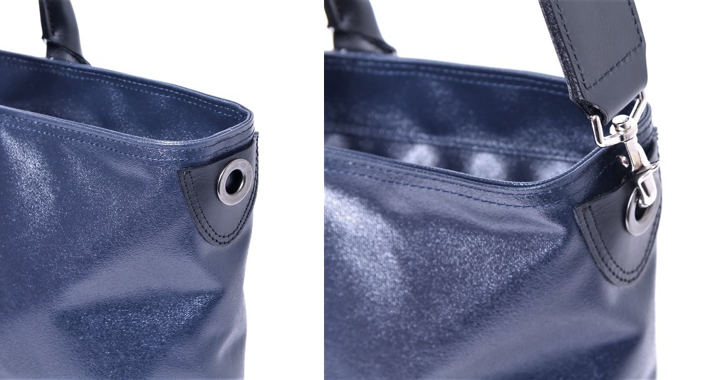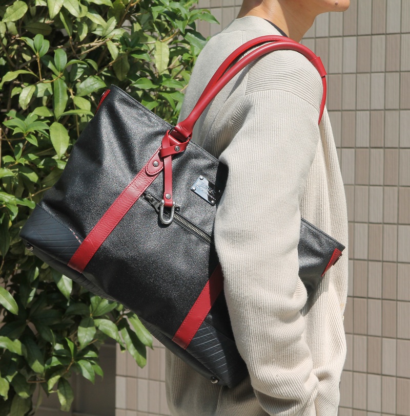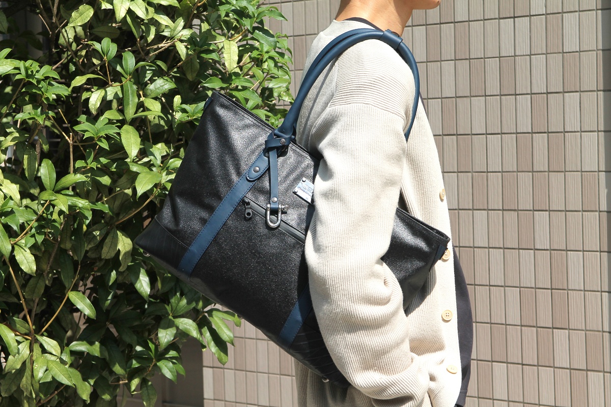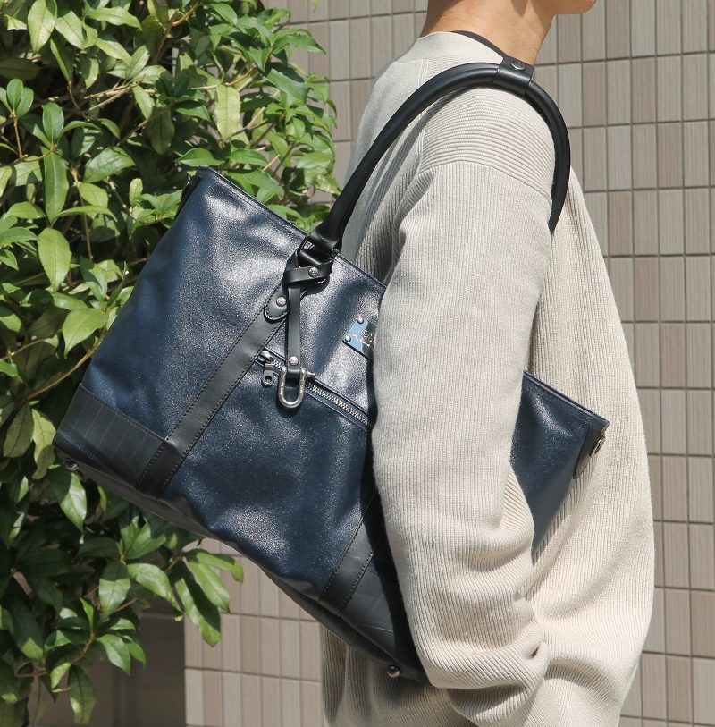 海上自衛隊でも採用されている森野帆布とチューブを使用して作られたトートバッグ。どちらも丈夫で耐久性があり防水素材というのも嬉しいポイント。
