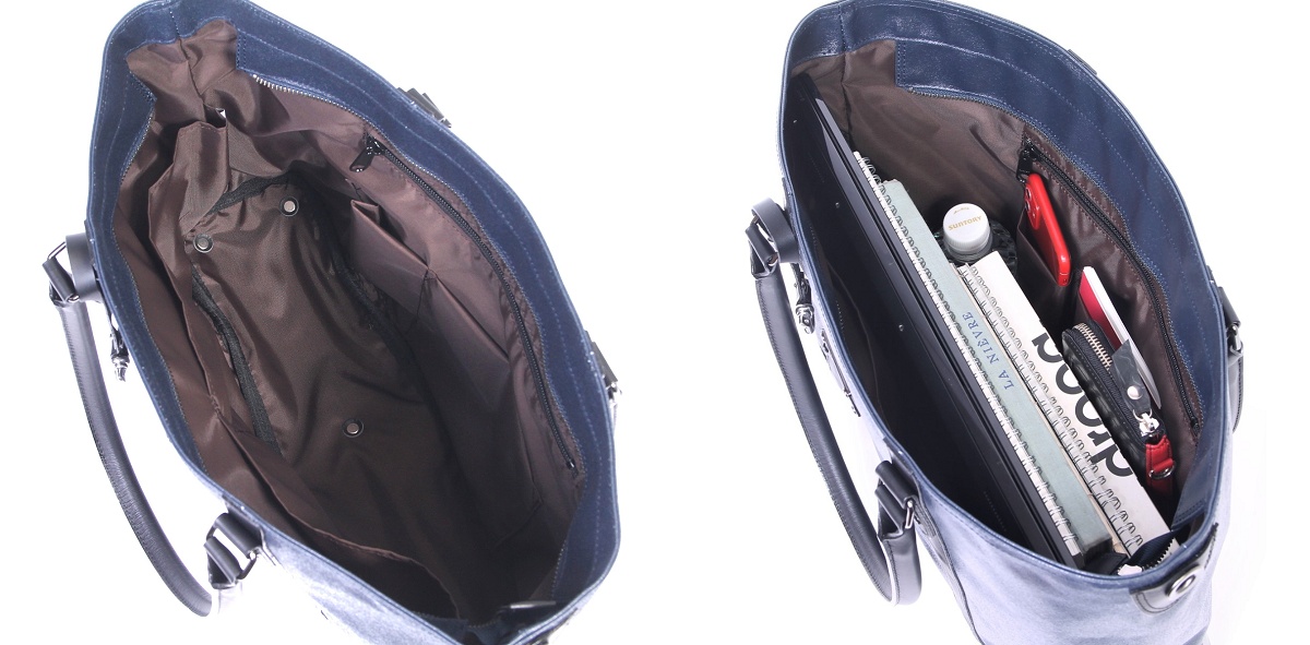 内装はオープンポケット4つとファスナー付きポケットが1つで、B4サイズの書類や17インチのノートPCまで十分に入る内容量です。
