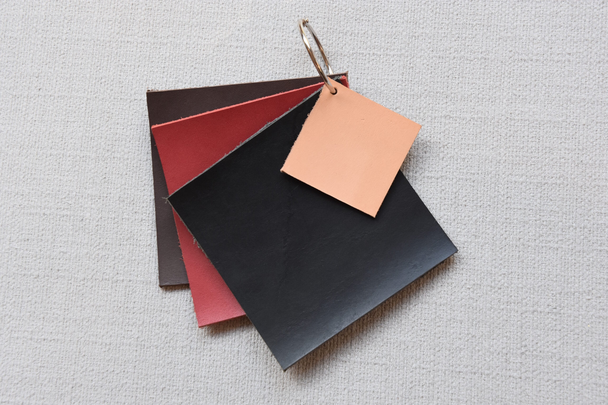 今回は受注生産という事で、こちらのハンドル部分と型絞り加工されたコーナー(四隅のパーツ)のレザーカラーをヌメ革の4色「ブラック・レッド・ブラウン・ナチュラル」よりお選びいただけます。
