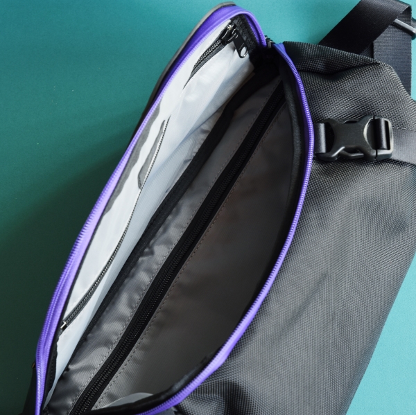 特徴的な曲線のファスナーにパープルの派手過ぎず、地味過ぎない、絶妙な色味がマッチしています。