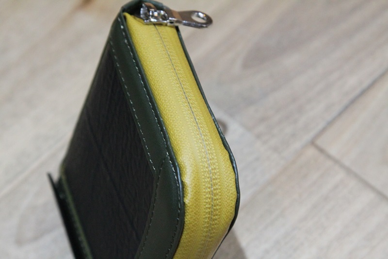 今回の二つ折り財布はメインファスナー部分を止水ファスナーにする事で防水性を意識した1点になりました。