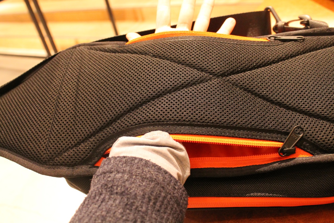 背面には右肩・左肩問わず使える背面ファスナーポケットが!